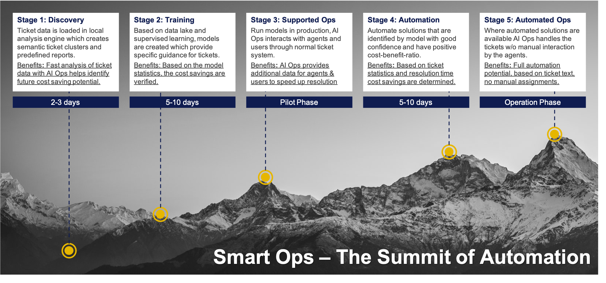 Over 70% of the total cost of ownership (TCO) of an enterprise application is spent on operations and maintenance. Also the services and support processes bear many inefficiencies like missing information, re-investigation of recurring incidents, repeated manual implementation of solutions, and in general a lack of documented and well structured knowledge. Based on our Smart Ops implementations at leading European Auto OEMs, IT organisations can reduce service cost and improve service quality by addressing these areas.